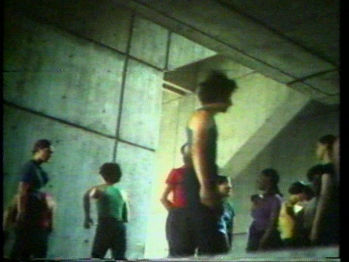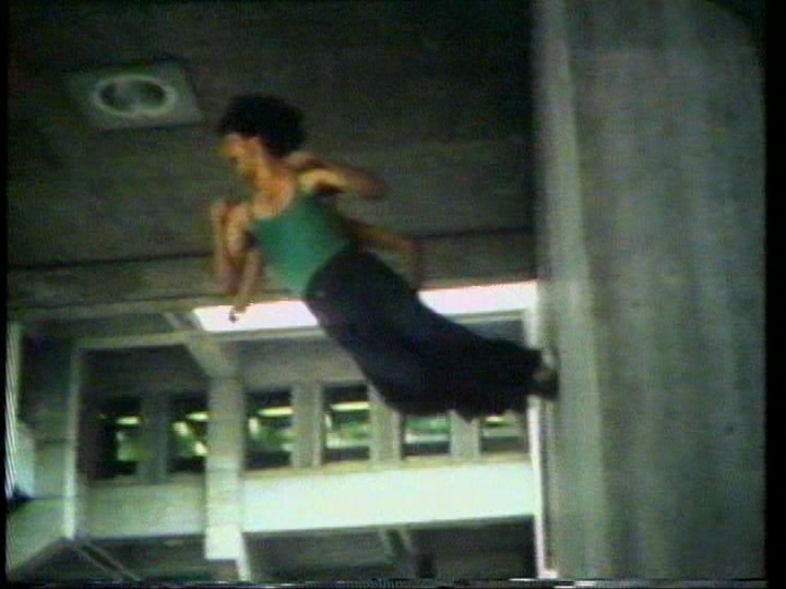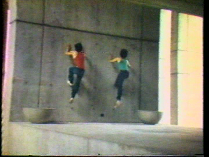 Second, I noticed a similarity between It Doesn’t Wait and dancer-choreographer Rudy Perez’s District 1 (1973). Both use an urban landscape for a backdrop, with dancers in casual street clothes. Perez’s piece isn’t available online but the eight still images below show his dancers interacting with the location—Boston’s City Hall—as well as moving through it. The work was well crafted: “Using still photography, portapak equipment and a small crew, Perez was able to create a series of studies for the work, which were used to carefully plan shots during the production of the actual work.” Audio came from marching bands.